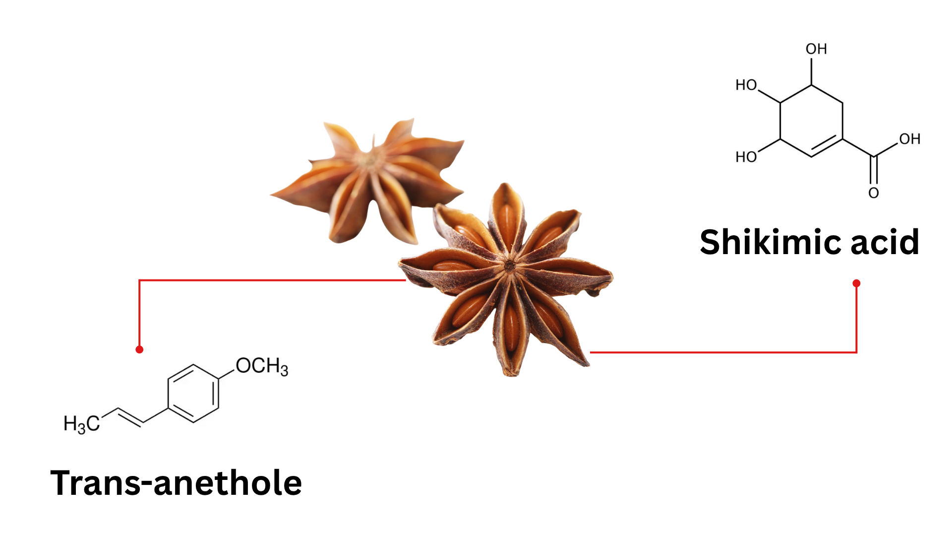 “Two molecules, two industries: trans-anethole (left) drives the flavor and fragrance value of star anise essential oil; shikimic acid (right) is the pharmaceutical precursor that Roche used to synthesize Tamiflu. Both come from the same fruit — but require entirely different extraction processes and buyer documentation.”